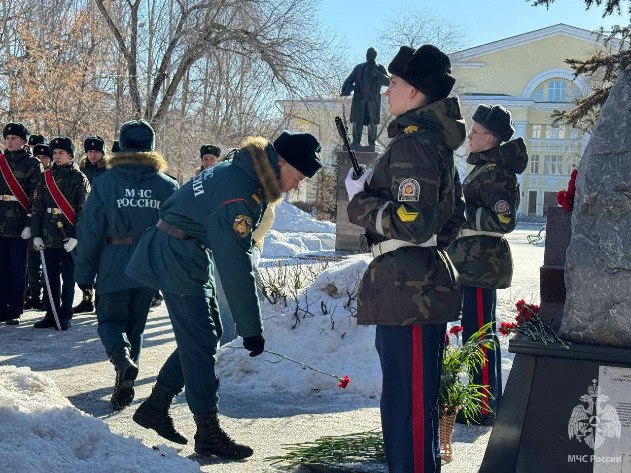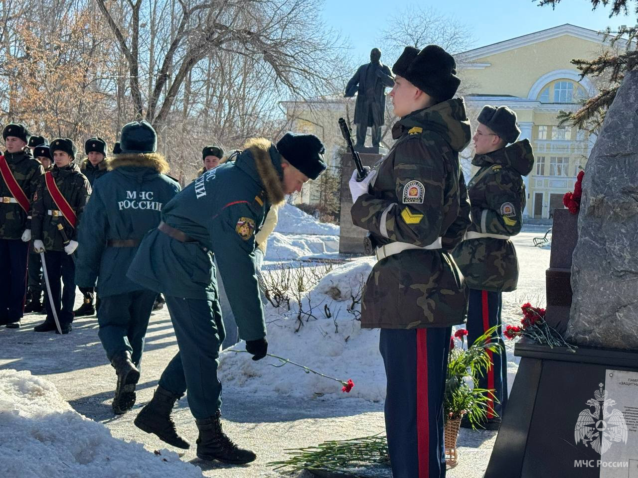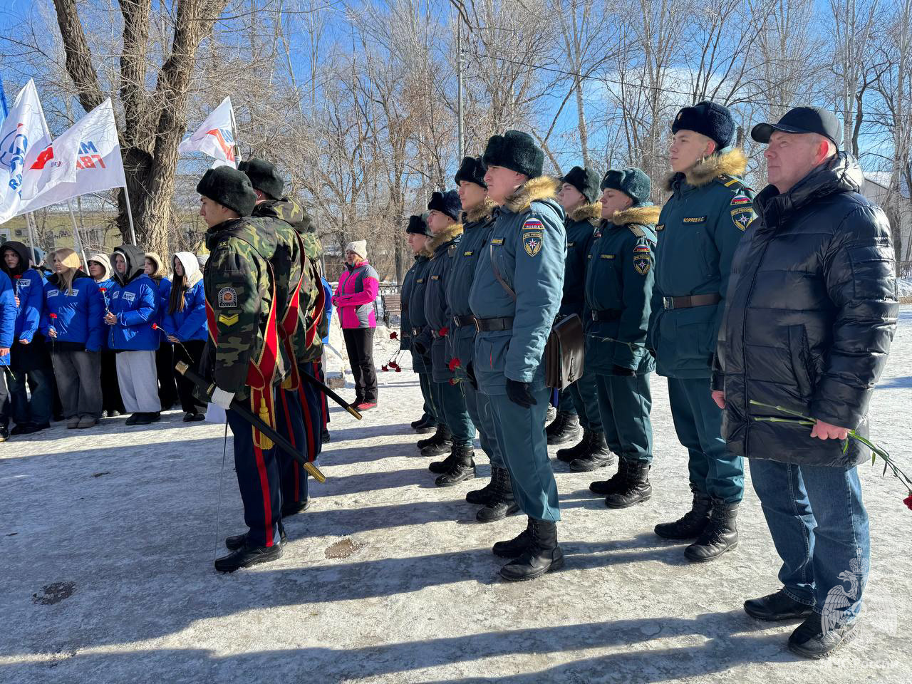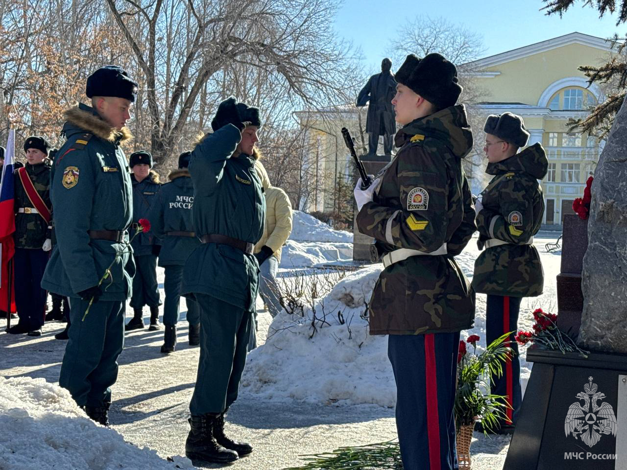 Знаменная группа кадетов школы №177 торжественно открыла митинг. Участниками стали не только военнослужащие спасательного центра и председатель ветеранской организации Сметанин Андрей Анатольевич, а также администрация Куйбышевского района, Актив Совета ветеранов района, активисты «Молодой Гвардии Единой России», учащиеся школы №74 с гордостью и трепетом почтили минутой молчания память ушедших бойцов и возложили цветы к мемориалу "Защитник Отечества".
