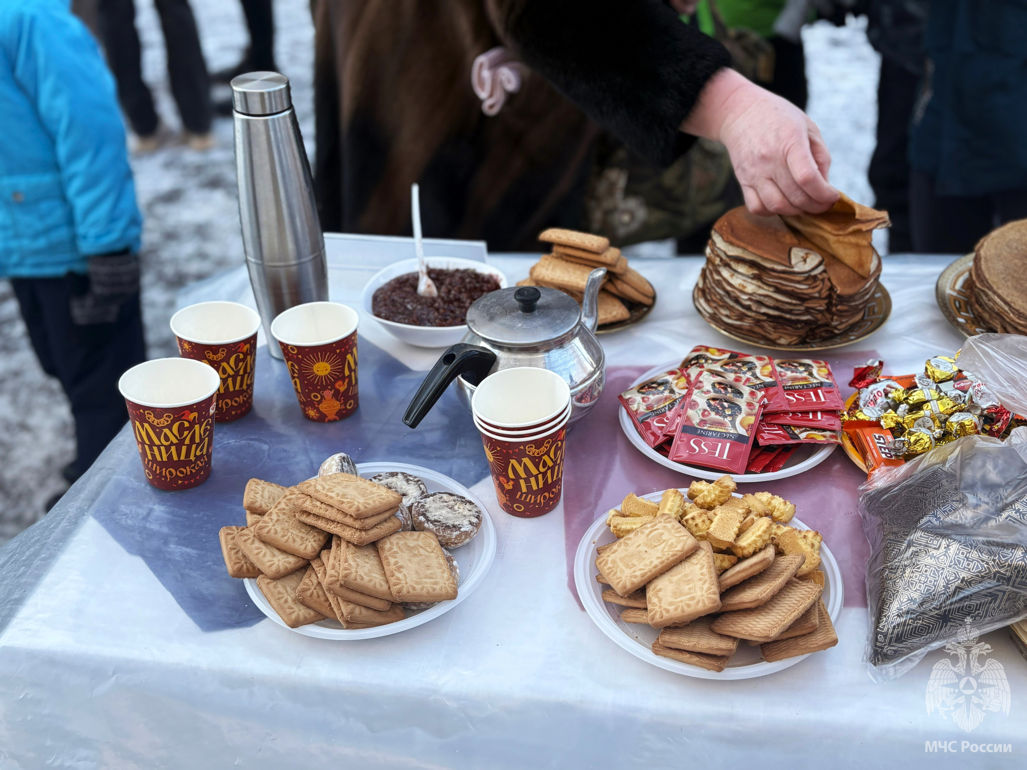 Для обеспечения комфортных условий были развёрнуты мобильные пункты обогрева. В течение всех гуляний гостям предлагали традиционное угощение: горячий чай, свежеиспечённые блины.